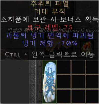 디아2 냉기파괴참의 정식 명칭은 추위의 파열 거대 부적으로 유니크 그랜드 참(유니크 거대 부적)에 해당합니다. 이번 디아블로2 레저렉션의 래더 시즌2에서 새로이 등장한 유니크 거대 부적으로 몬스터의 면역(내성)을 파괴시키는 파괴시키는 효과가 있어 "파괴참"이라고 부르며 냉기 면역을 파괴시키는 참을 "냉기파괴참"이라고 하며 여러 종류의 파괴참에 대해서는 아래 포스팅을 참고해주시기 바랍니다.